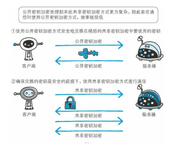 HTTPS 采用共享密钥加密和公开密钥加密两者并用的混合加密机制。若密钥能够实现安全交换,那么有可能会考虑仅使用公开密钥加密来通信。但是公开密钥加密与共享密钥加密相比,其处理速度要慢。所以应充分利用两者各自的优势,将多种方法组合起来用于通信。在交换密钥环节使用公开密钥加密方式,之后的建立通信交换报文阶段则使用共享密钥加密方式。