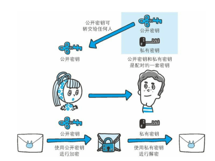 公开密钥加密方式很好地解决了共享密钥加密的困难。公开密钥加密使用一对非对称的密钥。一把叫做私有密钥 (private key),另一把叫做公开密钥(public key)。顾名思义,私有密钥不能让其他任何人知道,而公开密钥则可以随意发布,任何人都可以获得。使用公开密钥加密方式,发送密文的一方使用对方的公开密钥进行加密处理,对方收到被加密的信息后,再使用自己的私有密钥进行解密。利用这种方式,不需要发送用来解密的私有密钥,也不必担心密钥被攻击者窃听而盗走。另外,要想根据密文和公开密钥,恢复到信息原文是异常困难的,因为解密过程就是在对离散对数进行求值,这并非轻而易举就能办到。退一步讲,如果能对一个非常大的整数做到快速地因式分解,那么密码破解还是存在希望的。但就目前的技术来看是不太现实的。