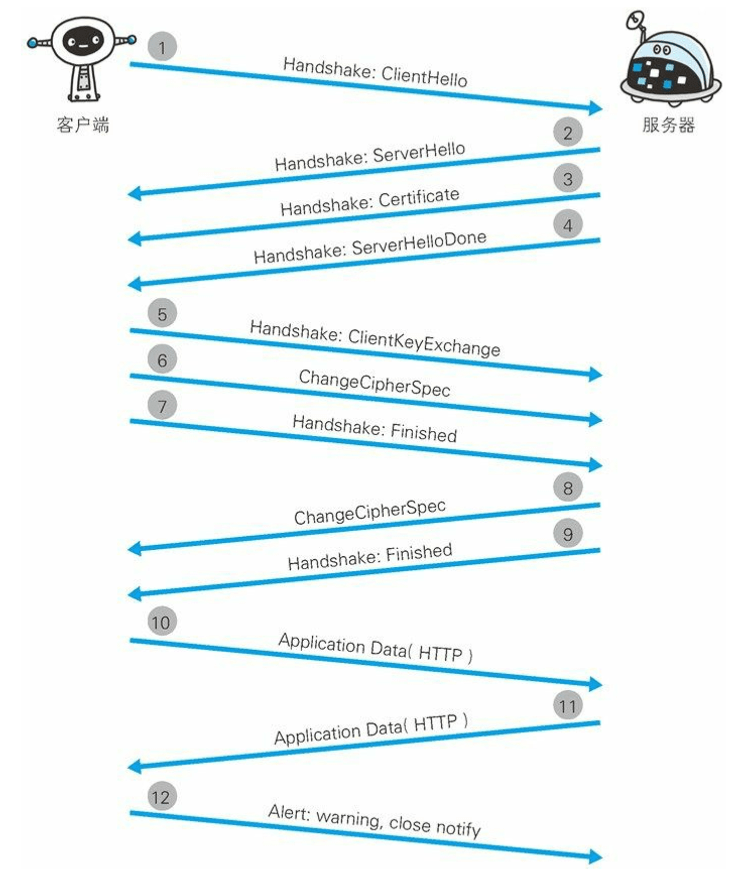 步骤 12: 最后由客户端断开连接。断开连接时,发送 close_notify 报 文。上图做了一些省略,这步之后再发送 TCP FIN 报文来关闭与 TCP 的通信。
