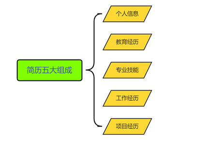 简历的书写主要包括五大基础部分:个人信息、教育经历、专业技能、工作经历、项目经历。