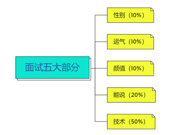 运气这个因素,也占10%,怎么说呢,张老师也是举了个例子,说是他面试了一个小伙,感觉技术也就一般,然后让另一位同事帮他再面试一下,另一位同事面试过后,也觉得技术也就那样,但是那位同事无意间发现,这个小伙的学校是东北那一块的,就随口问了一句家是东北的呀,结果发现他们都是东北人,然后两人就开始聊了起来,最后那位同事给那个小伙的分还挺高。所以,我们发现,有时候,运气这个东西,确实也会左右这个面试的结果。