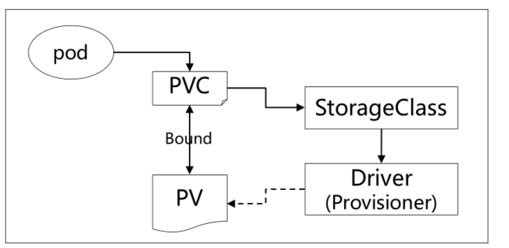 k8s通过存储声明(pvc)、存储类(SC)和存储抽件(ariver)从口L1P,满足用户一键式定义、创建存储。