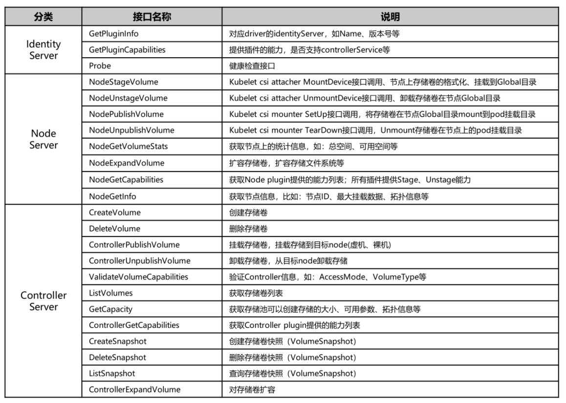 1.CSI接口可分为三类:identity、ControllerServer、nodeServer。