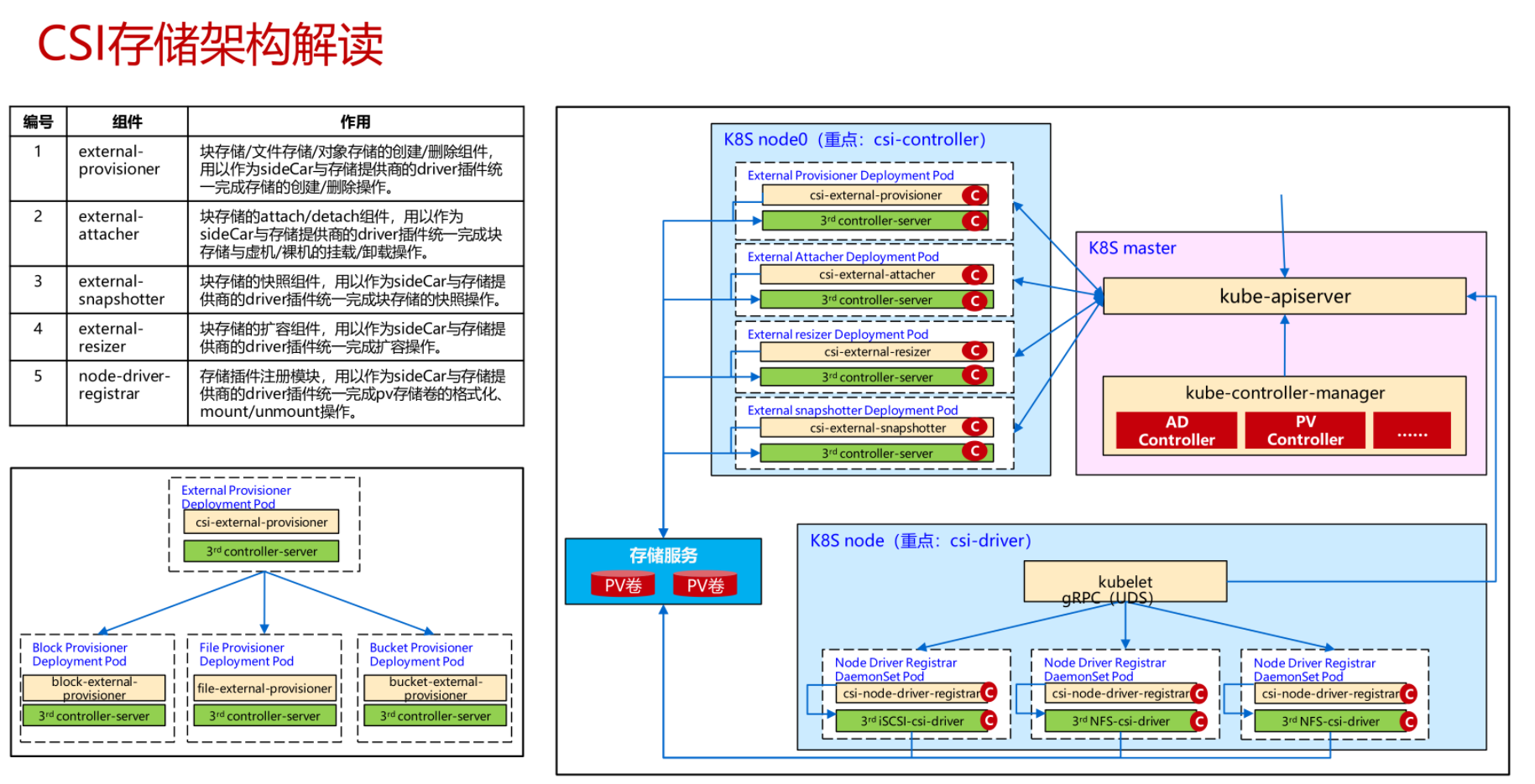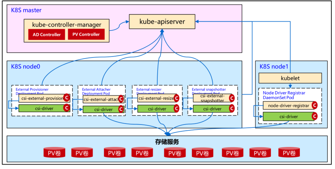 以CSI存储架构为例,解读容器存储架构,如下图所示: