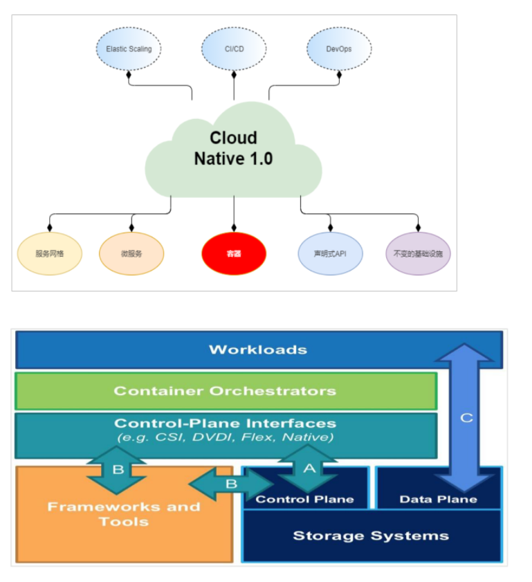 3.数据接口C:数据面,存储通过文件系统、块设备等方式为K8S平台中运行的workload提供存储读写等能力;