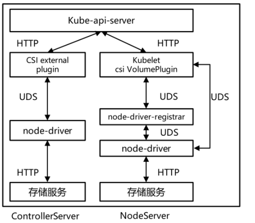 Kubelet与node-driver之间通过UDS调用,完成节点上卷的格式化、挂载给容器使用操作。