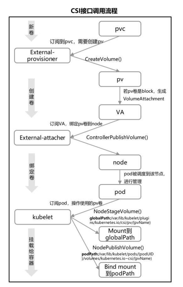 1.CSI接口调用流程,我们以块存储为例,图示接口调用,如右图所示;