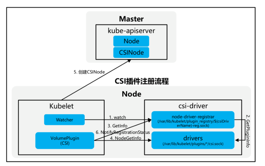CSI插件在kubernetes中的注册流程: