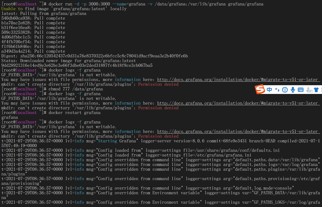 docker run -d -p 3000:3000 --name=grafana -v /data/grafana:/var/lib/grafana grafana/grafana