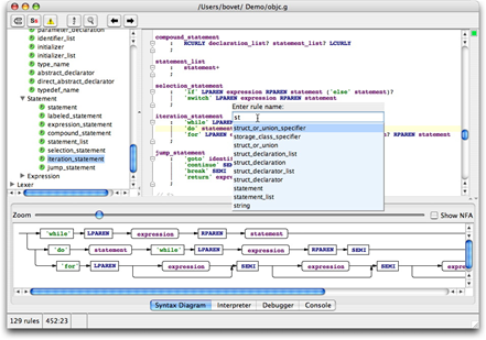 antlrworks是专门用于开发Antlr的IDE,可以检查规则文件的语法,进行语法高亮,调试规则文件,生成解析器、可视化语法图、解析树、AST,直观看到语法图、规则的依赖关系图