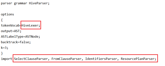 HiveParser.g是语法分析的总入口,里面import了四个规则文件