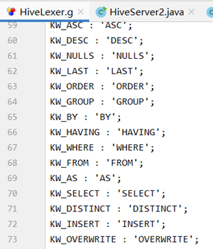 HiveLexer.g是Hive的词法文件,其中定义了Hive所有的关键字、保留字以及可以被Hive识别的合法字符,不在其中定义的字符,将被Hive认为是非法字符输入。