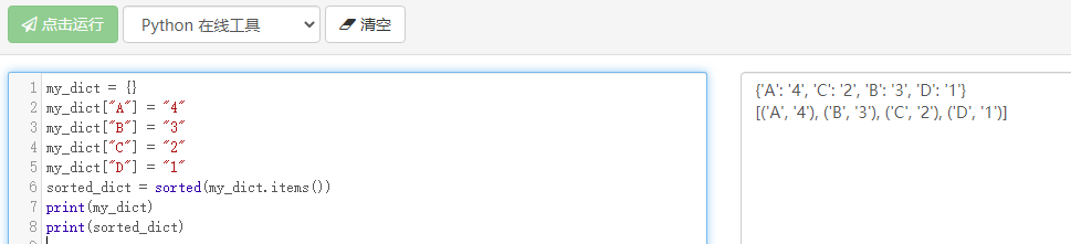 输出结果如下,得到的结果是按照字典的值进行排序的,这里需要注意的是 lambda 匿名函数在后续的课程将逐步展开