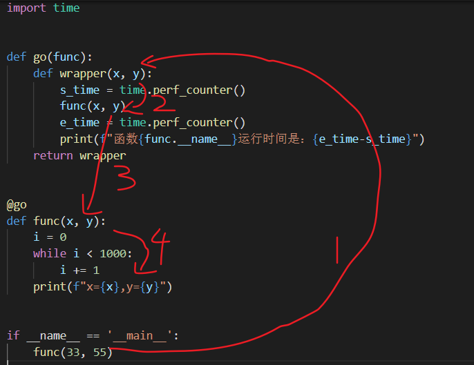 在执行装饰器代码装饰之后,调用 func(33,55) 已经切换为 go(gogo(func)),运行 gogo(func) 代码转换为下述内容: