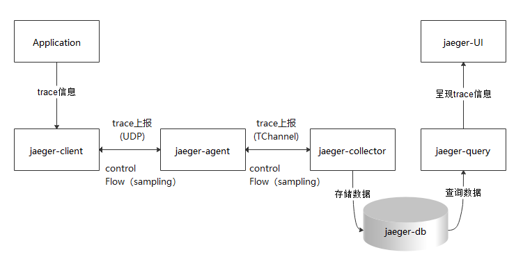 - jaeger-collector-->jaeger-agent-->jaeger-client: collector可以通过发起control flow控制流给jaeger-client,比如collector想要对trace数据进行sampling抽样,就发起samping flow,jaeger-client收到之后就进行响应。