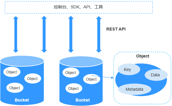 OBS:对象存储服务(Object Storage Service),是一个基于对象的海量存储服务,为客户提供海量、安全、高可靠、低成本的数据存储能力。基本组成是桶和对象。其产品架构如下:
