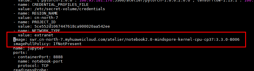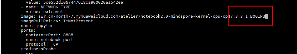 3)编辑该Notebook的yaml,替换实例中的镜像为自己构建的镜像,命令如下: