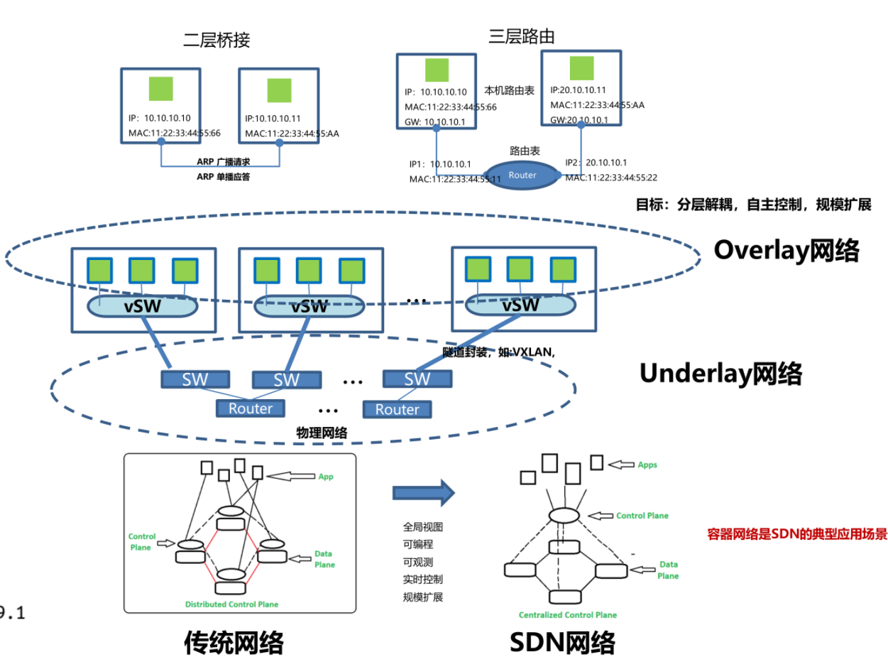 二层桥接VS三层路由 Underlay VS Overlay 物理网络 VS 虚拟网络 传统网络 VS SDN网络 Docker网络 VS K8S网络(CNM vS CNI)