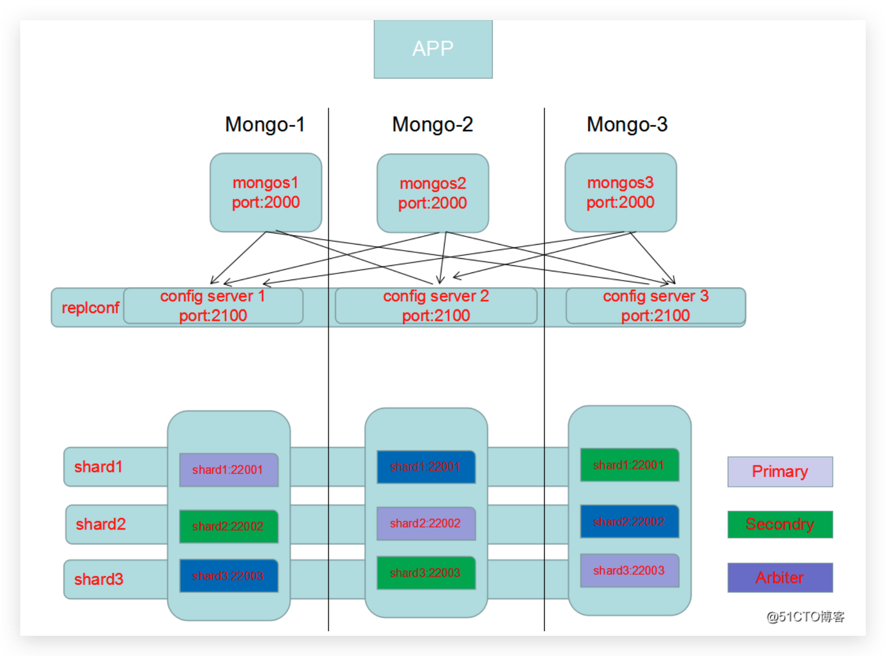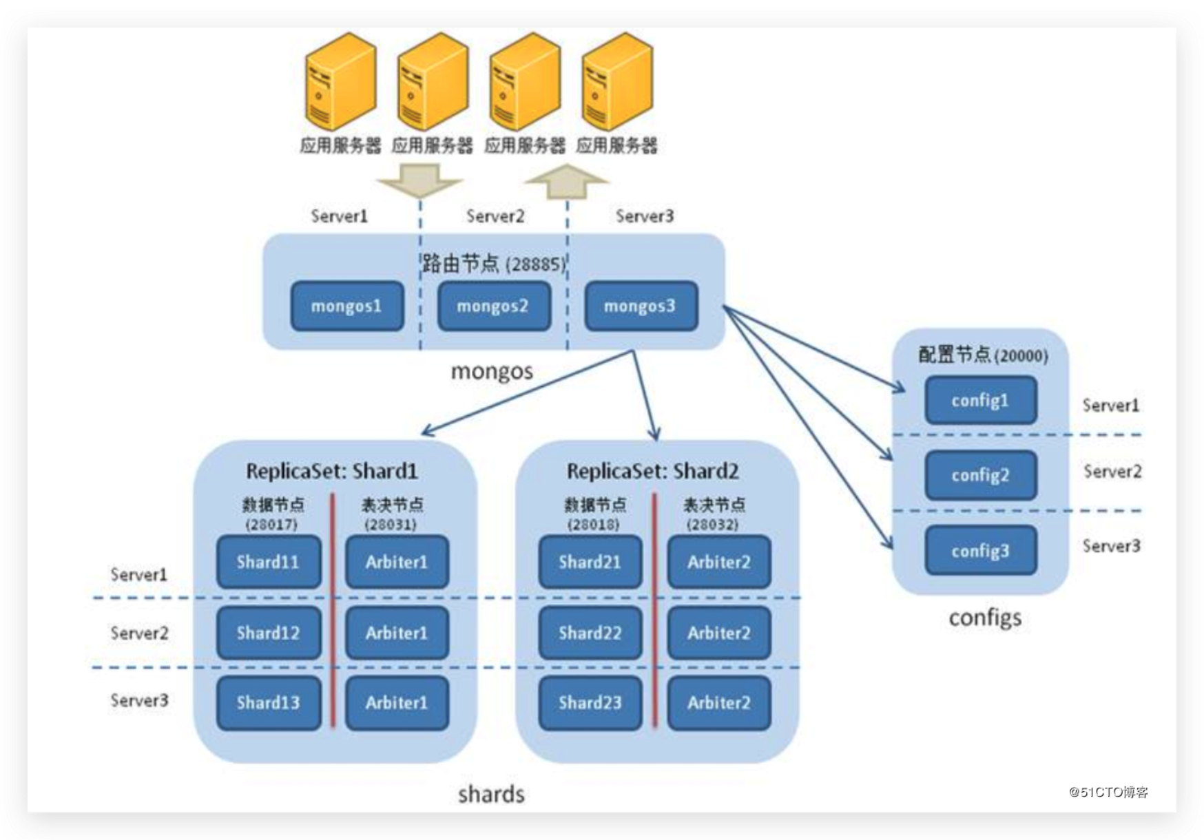 为了节省服务器,采用多实例配置,三个mongos,三个config server,单个服务器上面运行不通角色的shard(为了后期数据分片均匀,将三台shard在各个服务器上充当不同的角色。),在一个节点内采用replica set保证高可用,对应主机与端口信息如下: