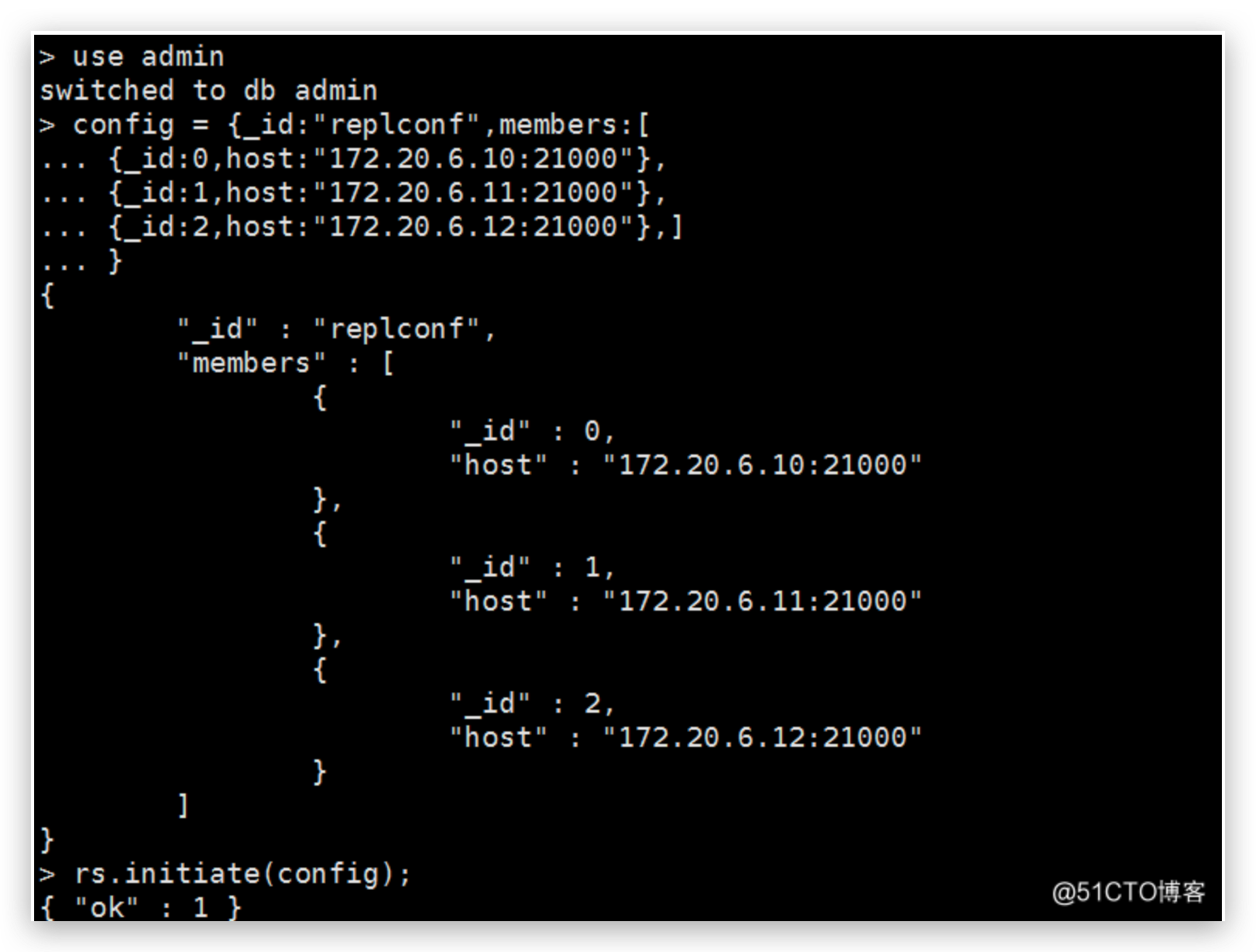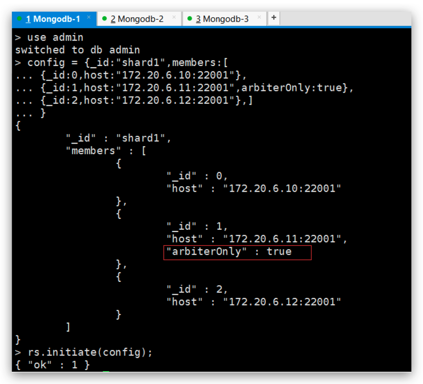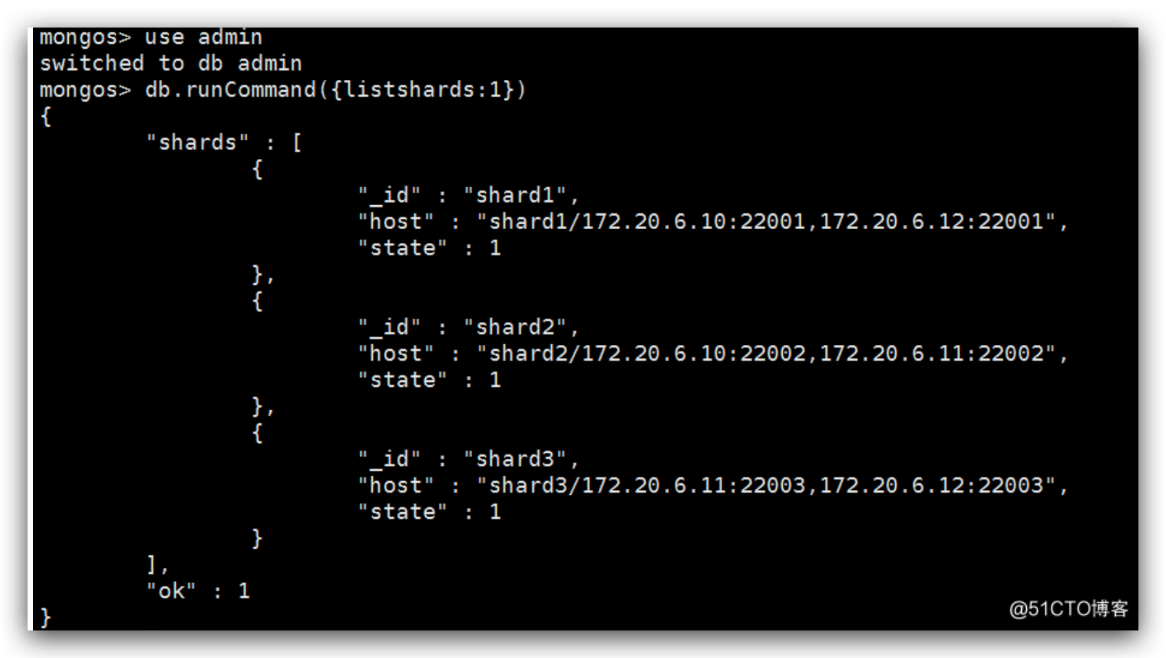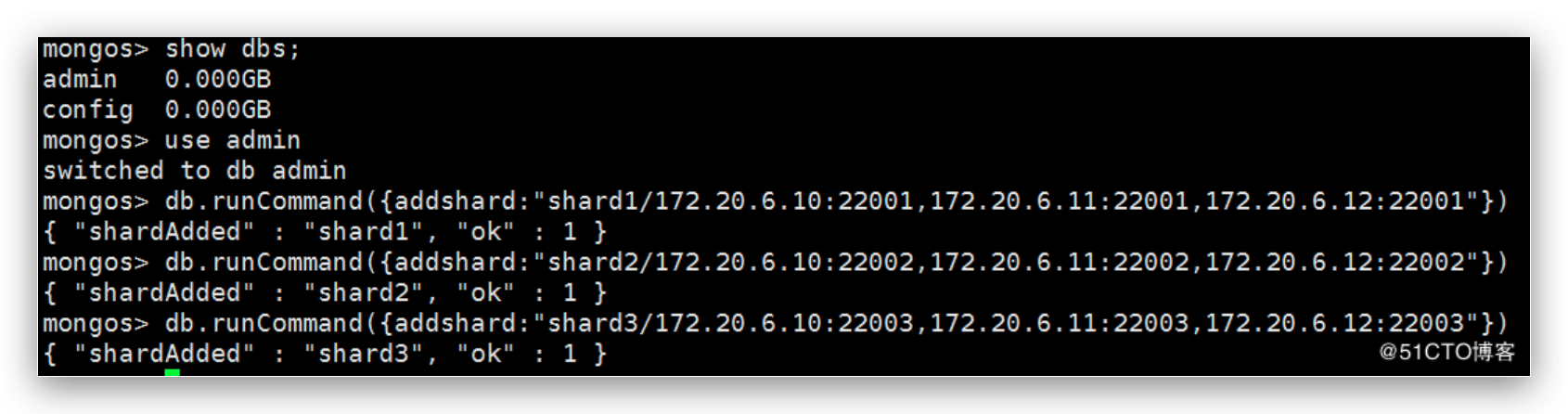 db.runCommand({addshard:"shard1/172.20.6.10:22001,172.20.6.11:22001,172.20.6.12:22001"})