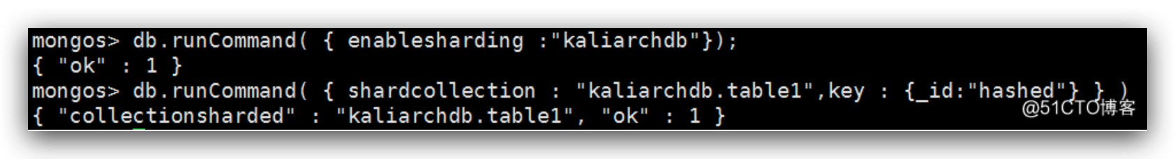 db.runCommand( { enablesharding :"kaliarchdb"}); #开启kaliarch库分片功能