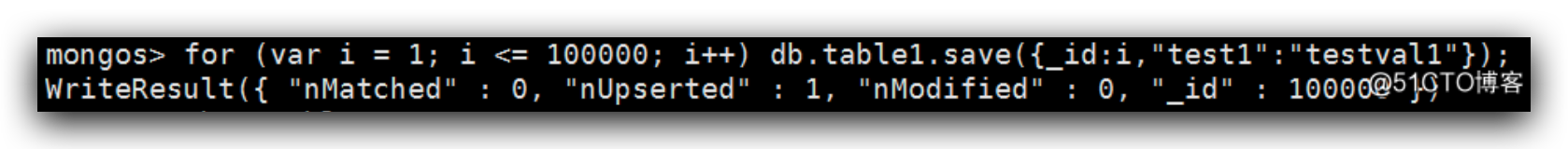 for (var i = 1; i <= 100000; i++) db.table1.save({_id:i,"test1":"testval1"});