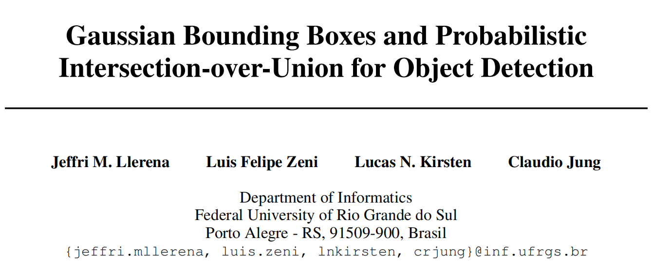 [1] Llerena, Jeffri M., et al. "Gaussian Bounding Boxes and Probabilistic Intersection-over-Union for Object Detection." arXiv preprint arXiv:2106.06072 (2021).