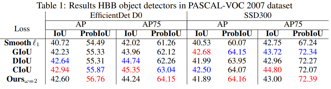 将基于 ProbIoU 的损失函数用于 HBB 检测任务中, 分别采用 EfficientDet D0 和 SSD 300 在 PASCAL-VOC 2007 数据集训练。如下表所示, 相对于 IoU , 采用 ProbIoU 方法 在 AP 及 AP75 均有提升,采用基于 ProbIoU 的损失函数的模型均能达到较高 AP 。