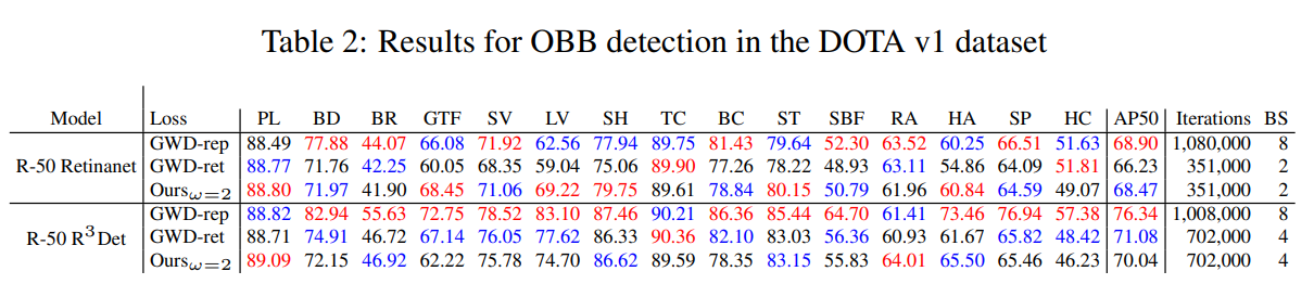 将基于 ProbIoU 的损失函数用于OBB 检测任务中, 分别采用 R-50 Retinanet 及 R-50 R3Det ,在 DOTA v1 及 HRSC2016 数据集进行训练。如下表所示,在 DOTA V1 数据集,采用 Retinanet 模型时,基于 ProbIoU 的 损失函数 AP 比 GWP-ret 高 2%;采用 R3Det 模型时, 其结果与GWD-rep 和GWD-ret 接近。在 HRSC2016 数据集上,基于 ProbIoU 的损失函数结果与GWD-rep 相当, 并且优于GWD-ret 。