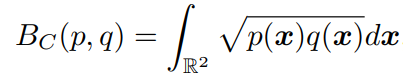 其中 BC (p,q ) ∈ [0,1], 当且仅当两个分布相同时,BC (p,q)=1 。