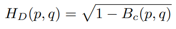 由于 Bhattacharyya Distance 不满足三角不等式,所以它并不是真实的距离,因此,为表示真实距离,采用 Hellinger Distance (HD) ,其公式如下: