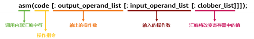 内联的汇编语句以asm开头,有时也会使用_asm_,后面可加参数”_volatile__"表示编译器不要优化代码,后面的指令保留原样