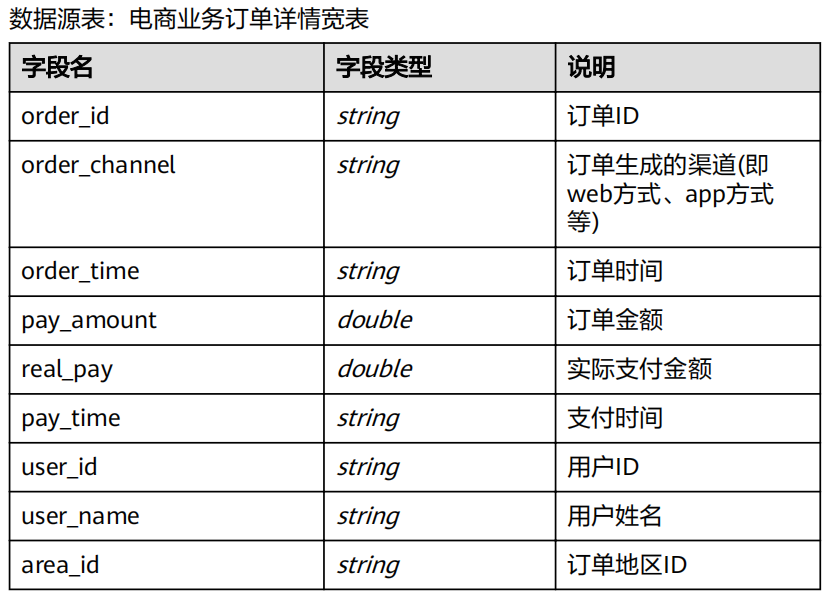 {"order_id":"202103270606060001", "order_channel":"appShop", "order_time":"2021-03-25 06:06:06", "pay_amount":"50.50", "real_pay":"50.50", "pay_time":"2021-03-25 06:07:00", "user_id":"0001", "user_name":"Alice", "area_id":"330106"}