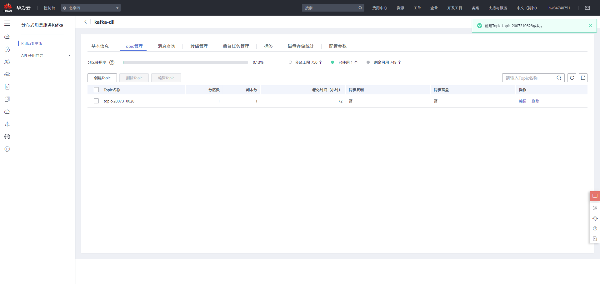 步骤3:获取DMS连接地址并创建Topic。获取DMS Kafka实例连接地址并创建DMSTopic。
