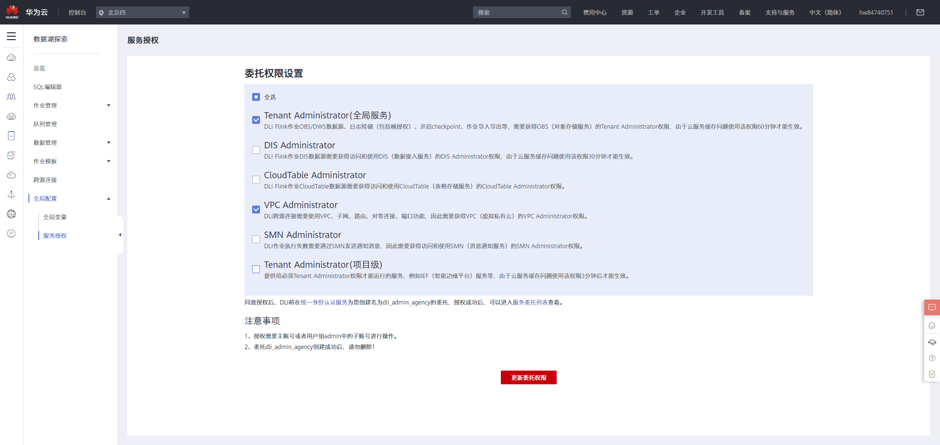 点击【全局配置】-【服务授权】,选中【VPC Administrator】,点击更新委托权限。此举目的是赋予DLI操作用户VPC资源的权限,用于创建VPC【对等连接】。