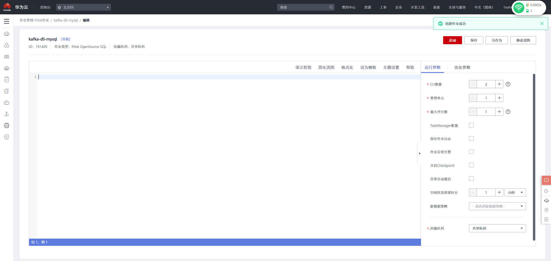 步骤6:创建并提交Flink作业。创建DLI Flink OpenSource SQL作业并运行。