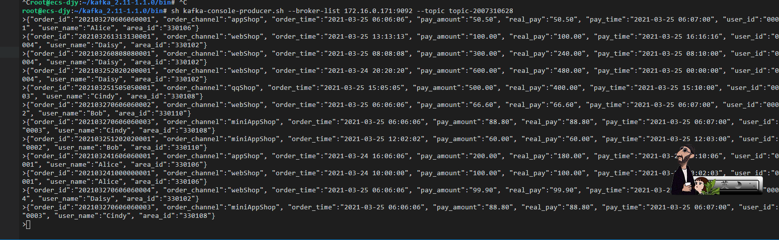 {"order_id":"202103251202020001", "order_channel":"miniAppShop", "order_time":"2021-03-25 12:02:02", "pay_amount":"60.00", "real_pay":"60.00", "pay_time":"2021-03-25 12:03:00", "user_id":"0002", "user_name":"Bob", "area_id":"330110"}