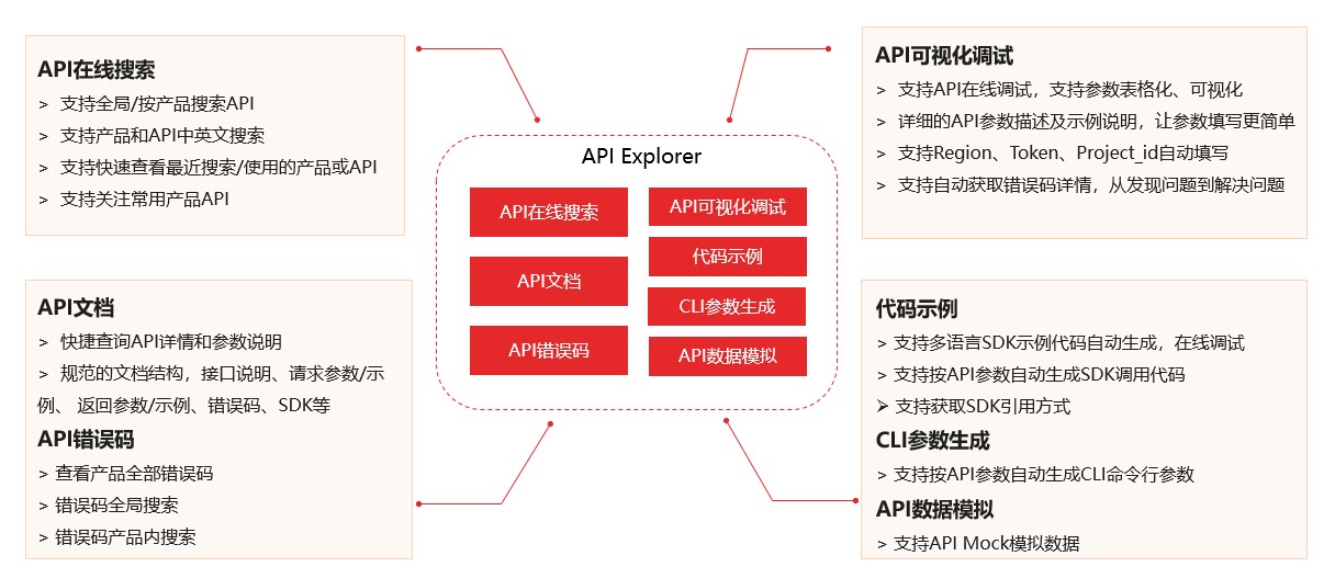从华为云官网——开发者——资源工具,即可进入到API Explorer页面,这里包括华为云开放的所有API信息,选手在这个平台上可以快速的查看、搜索API文档,以及可视化调试API,具体的关键能力如下图所示。