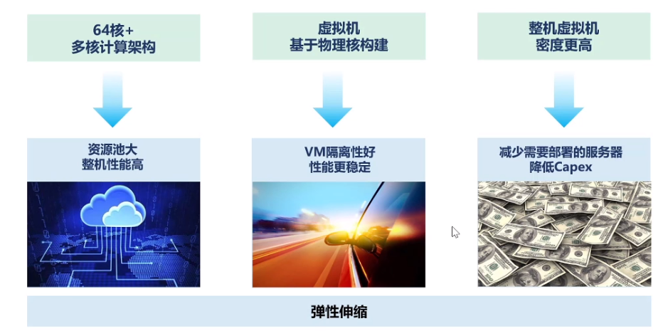 - 整机虚拟机密度更高:减少需要部署的服务器降低Capex;