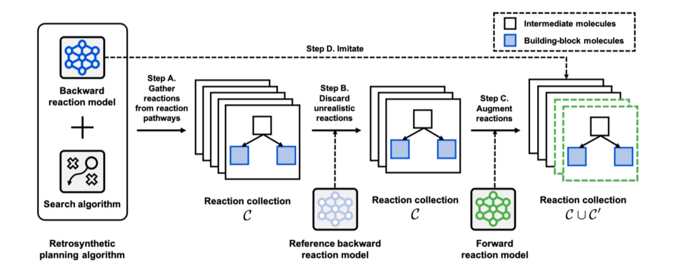 Step D.训练逆向反应模型。模拟真实反应集和增强反应集中的反应(即最大化对数似然)以训练逆合成模型。
