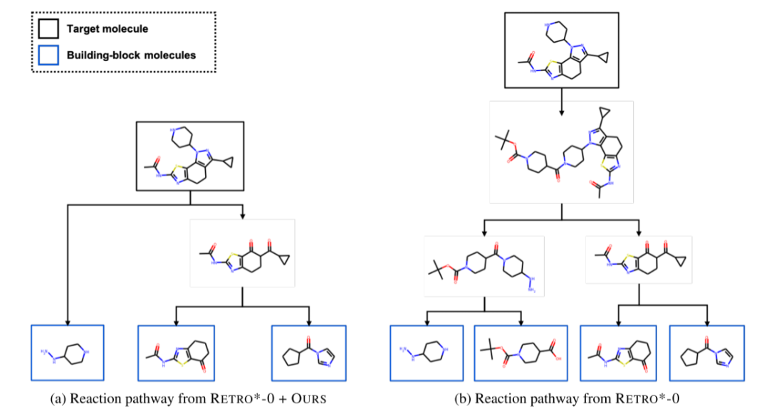 下图展现了同一目标分子分别由(a)Retro*-0+OURS和(b)Retro*-0搜索得出的反应路径。在这个例子中,Retro*-0规划的反应路径长度较短,即更易在实验室中合成。