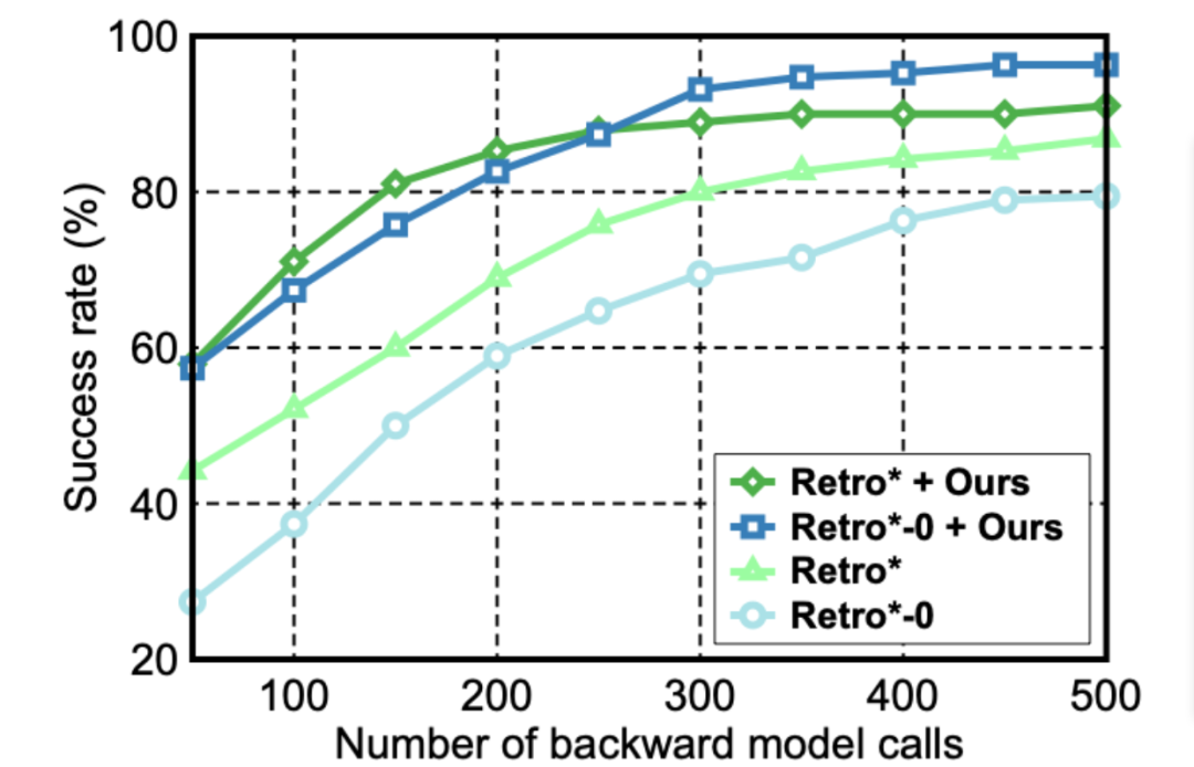 表1和图5结果表明,该框架与Retro*或Retro*-0结合显著优于基线。另外,在设计合成路径的成本和长度上,Retro*-0+OURS 和Retro*+OURS也有明显的优势。