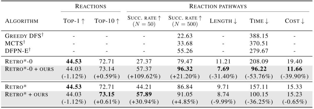 单步逆合成反应模型使用TOP-1和TOP-10的精确匹配度进行评估。使用SUCC.RATE,LENGTH,TIME,COST对反应路径进行评估。N表示逆合成反应模型调用的极限。LENGTH是指路线中的反应数量。TIME是由逆合成反应模型调用的数量来衡量的,上限为500。GREEDY DFS、MCTS和DFPN-E的实验结果来自Chen等人的文章。最好的结果用粗体字标注。括号中报告了与不使用该框架的对应方法指标的相对增益。