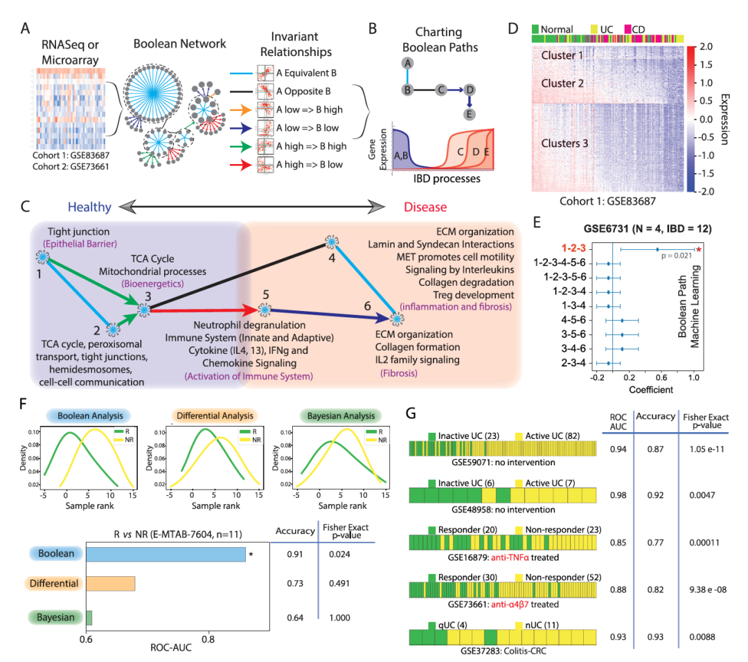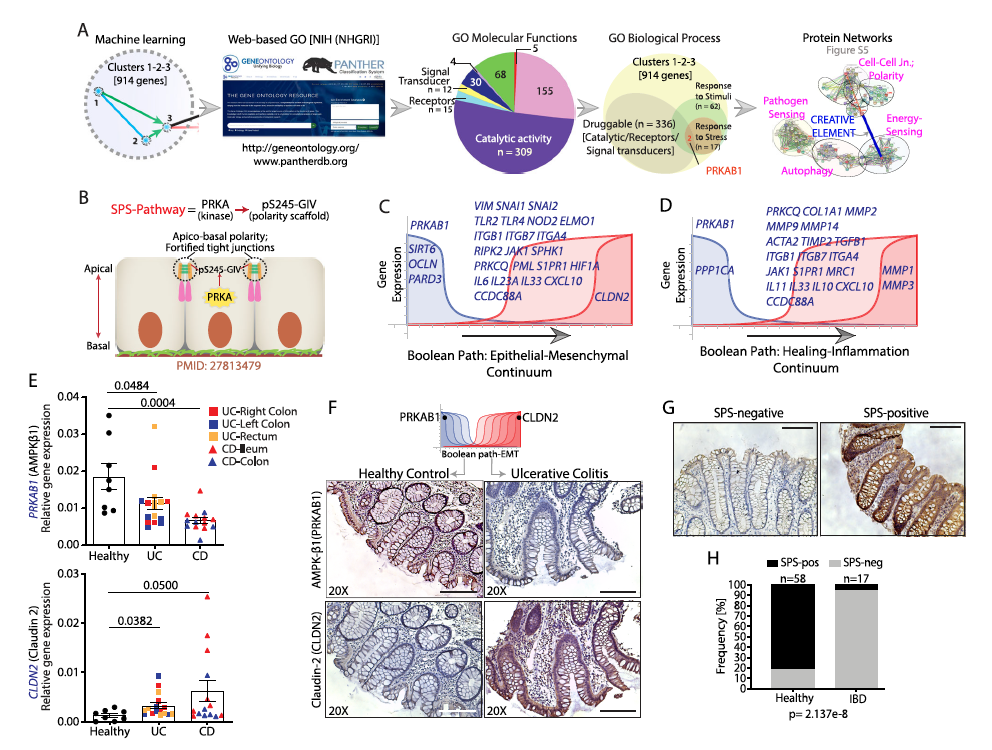 作者在BoNE中引入了机器学习,旨在识别哪些通过布尔蕴涵关系连接的基因簇在区分健康样本和患病样本方面最为理想。BoNE计算自然排序样本的分数,这个分数可以被认为是一个连续的状态。在所有可能的排列和组合中,簇#1-2-3(C#1-3)在区分正常健康样本与受IBD影响的样本方面表现最好,准确度最高。正如布尔关系的不变性所预期的那样,该C#1-3在所有独立训练(n = 3)和验证(n = 6)队列中始终表现良好。与微分和贝叶斯方法相比,布尔方法在预测治疗反应方面可能更有优势。此外,BoNE揭示了C#1-3特征根据疾病的侵袭性在五个额外的验证队列中始终如一地分离样本的能力;它可以区分活动性和非活动性疾病,区分接受两种不同生物制剂(Infliximab或Vedolizumab)的反应者和无反应者,甚至可以区分有或没有远处肿瘤的静止期疾病(图2G)。同时利用BoNE的预测能力进行合理化的靶点识别和药物发现,PRKAB1可作为屏障保护治疗靶点。通过访问BoNE的另一个功能探索了IBD网络内的疾病连续路径,确定PRKAB1激动剂如何影响IBD,PRKAB1激动剂在网络合理化的小鼠模型中改善结肠炎,并且保护网络合理化类器官模型中的上皮屏障。