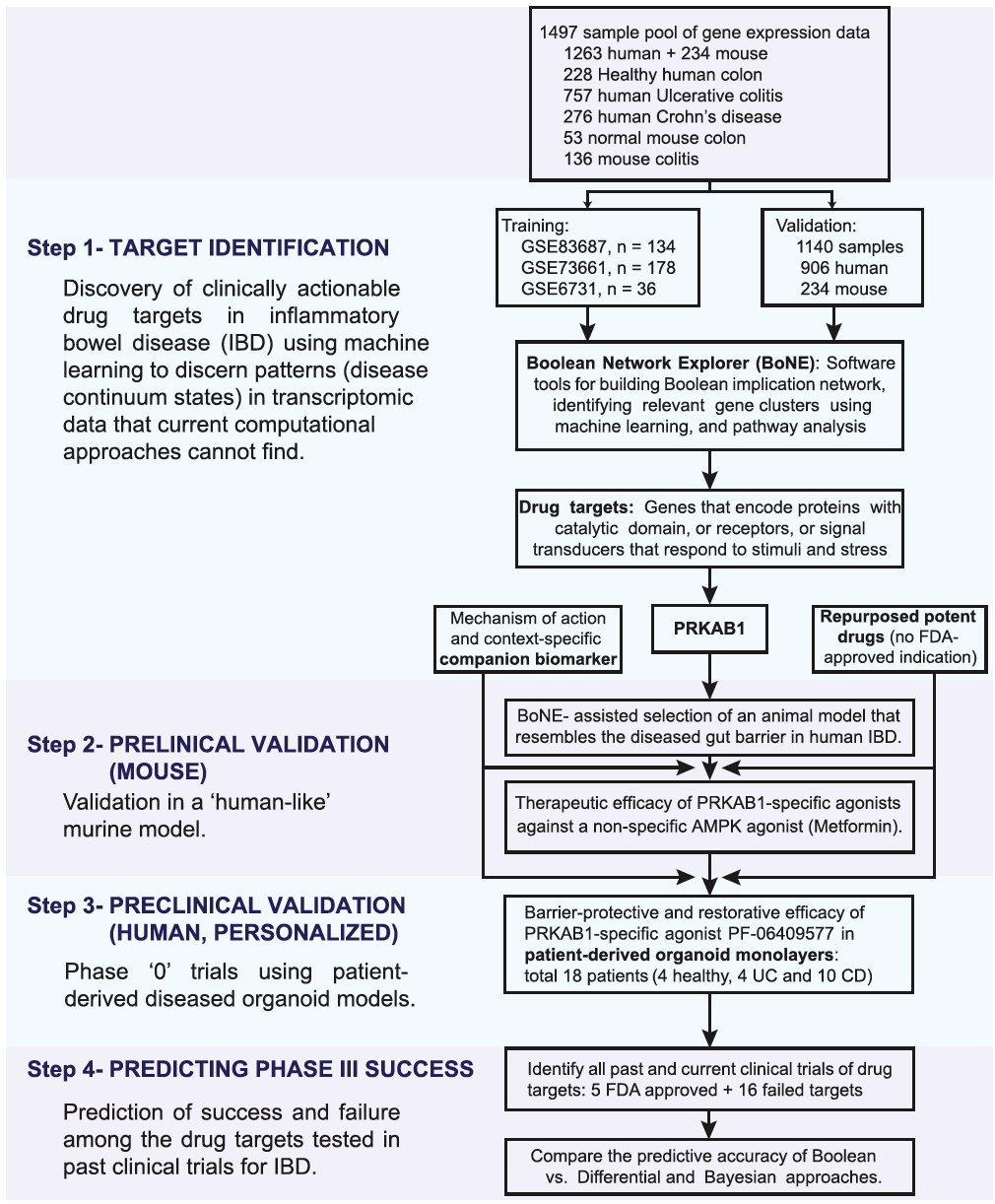 本文作者使用AI引导的药物发现方法确定了恢复和/或保护IBD肠道屏障完整性的疗法。该方法在三个基本方面不同于目前的做法:1)由布尔蕴涵网络引导进行靶点识别和预测建模;2)在最准确地概括人类疾病的网络合理化动物模型中进行靶点验证;3)在人类临床前类器官共培养模型中进行靶点验证,激发了“0”期试验的概念,有可能使疗法的选择个性化。这些方法的组合协同作用验证了解决IBD中肠道屏障破裂的一流药物。