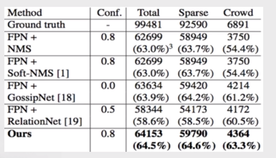 那在密集场景的检测如何解决这个问题呢?要解决这些问题需要加入比较复杂的NMS机制,而CrowdHuman数据集数据量比较大,上面都是一些密集的同类的事物,使得NMS失效。