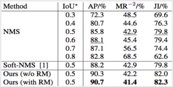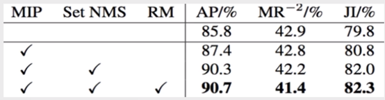基础检测上加上MIP、Set NMS、RM以后,AP、MR、JI的效果变化,如下: