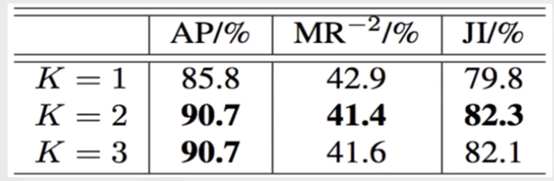 预设一个k值,即一个proposal回归几个框,由图可知,预设k值为2时,一个proposal回归2个框,效果最好。