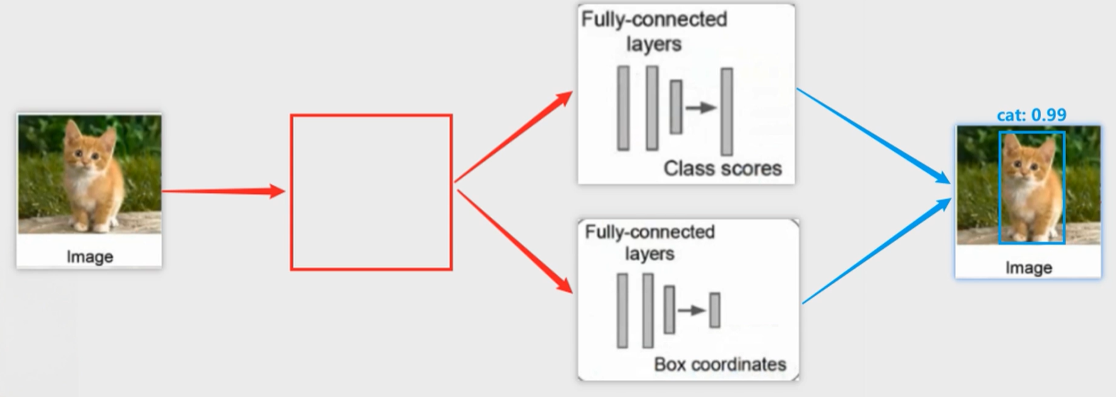 这是一个常规的目标检测流程,输入是一张猫的图片,根据深度学习,目标框架完成,为了把结果可视化,把两个向量做个处理,最终输出一张图片,图片上有分类显示是猫并标出位置。