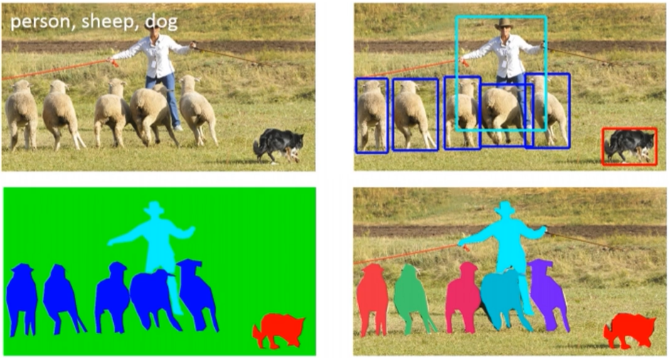 4.实力分割(Instance segmentation):在前面的基础上,将每一只羊单独分出来。